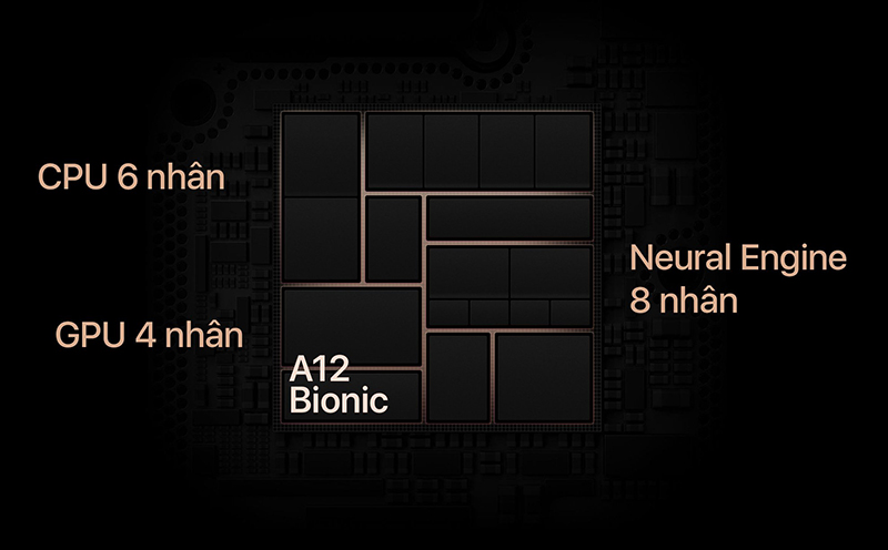 Apple A12 Bionic được xây dựng trên tiến trình 7nm đầu tiên của hãng với 6 nhân giúp iPhone Xs có được một hiệu năng “vô đối” cùng khả năng tiết kiệm năng lượng tối ưu.